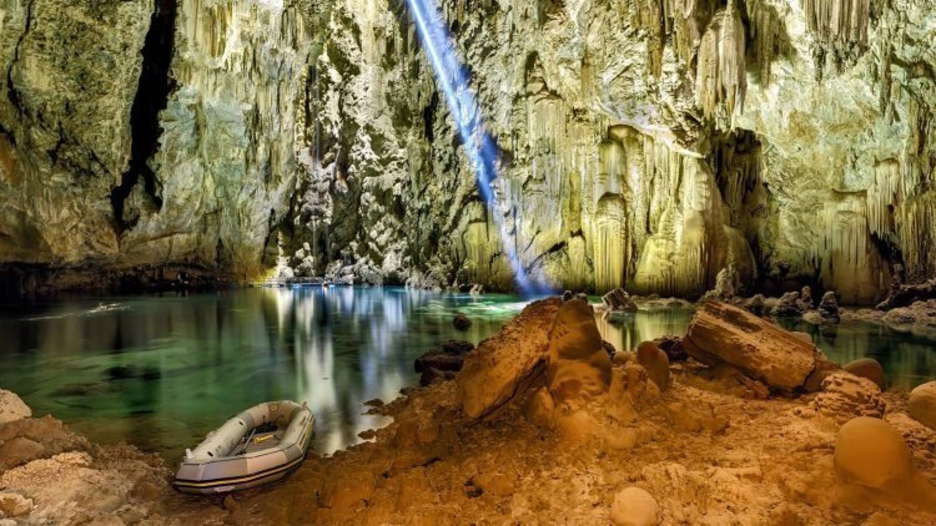 Depois de descer por meio de um rapel elétrico, você faz um passeio de bote por um imenso lago de água cristalina.